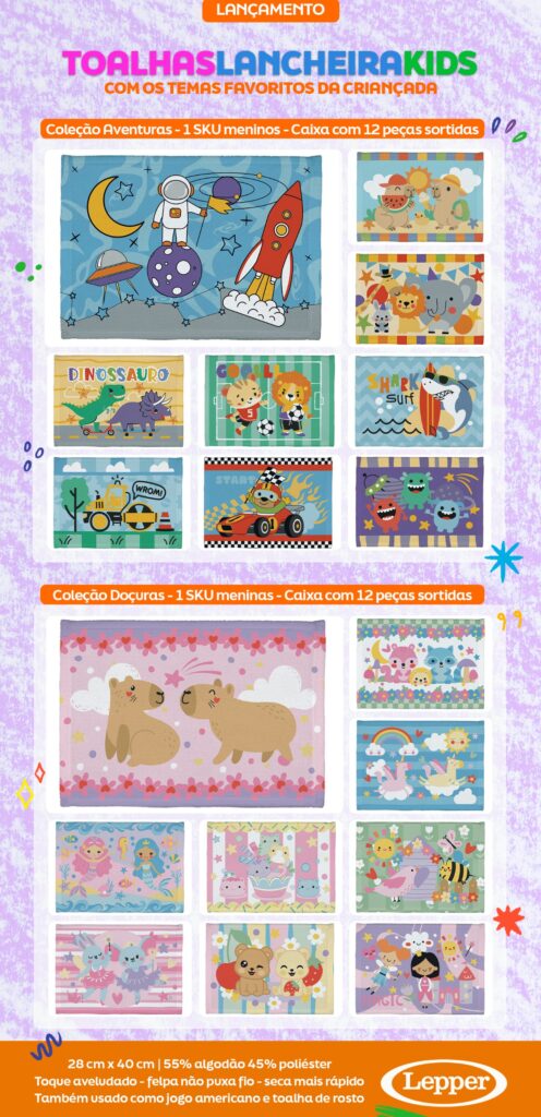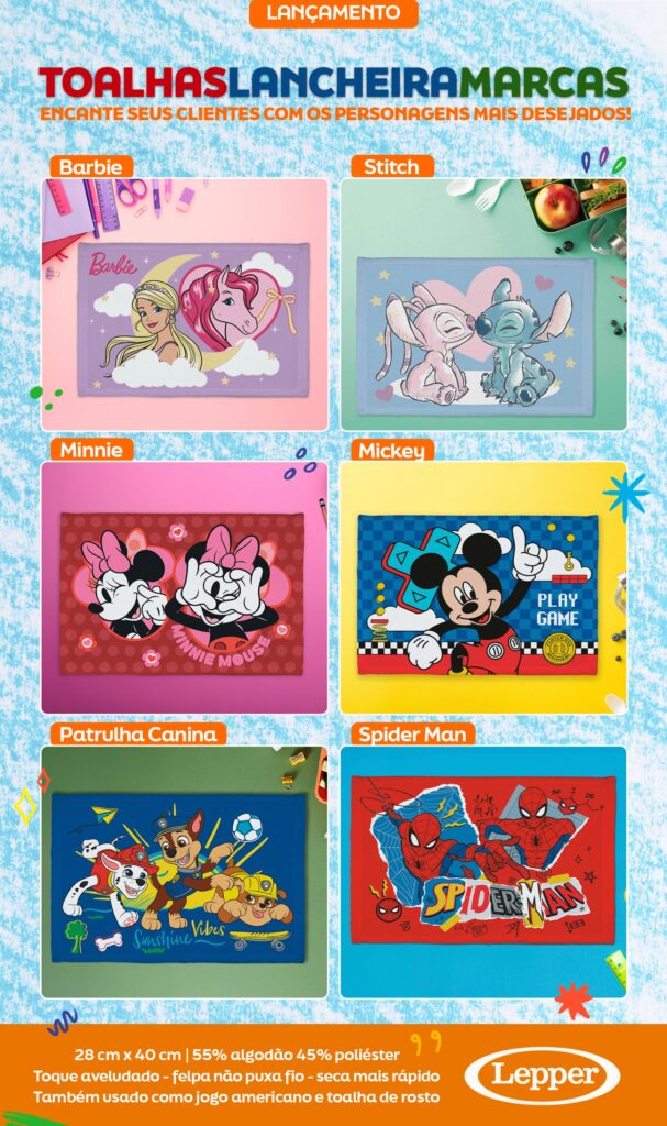 As Toalhas de Lancheira Lepper são um produto de alto giro, com forte apelo visual e uma qualidade superior que fideliza o cliente.